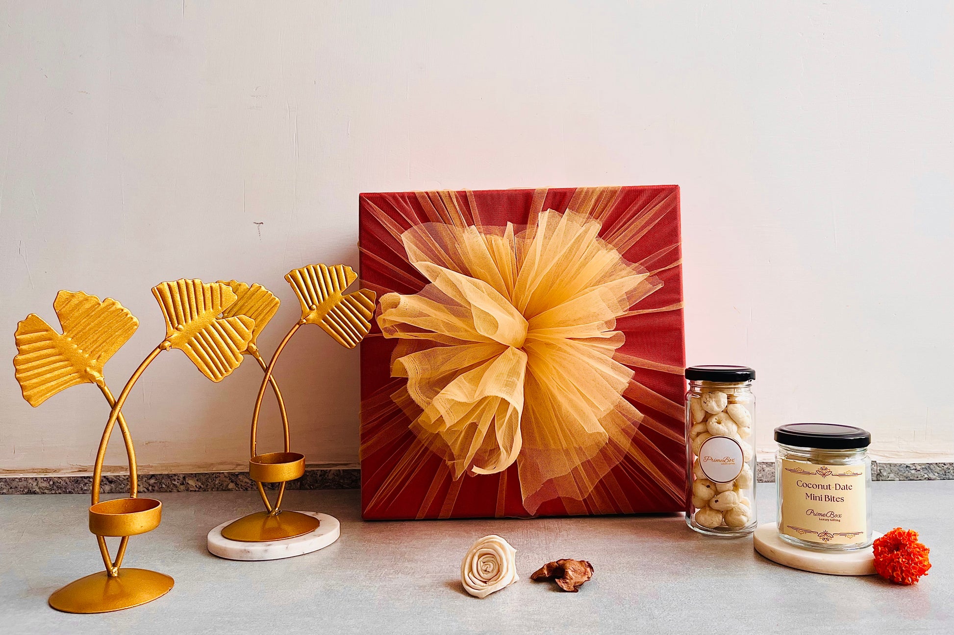 Bring light, health, and happiness together with this unique festive hamper. Illuminate your space with the elegant leaf lamps, enjoy the wholesome crunch of spicy makhana, and savor the natural sweetness of date bites. A perfect gift for Diwali, housewarmings, or to share festive cheer with family and friends.