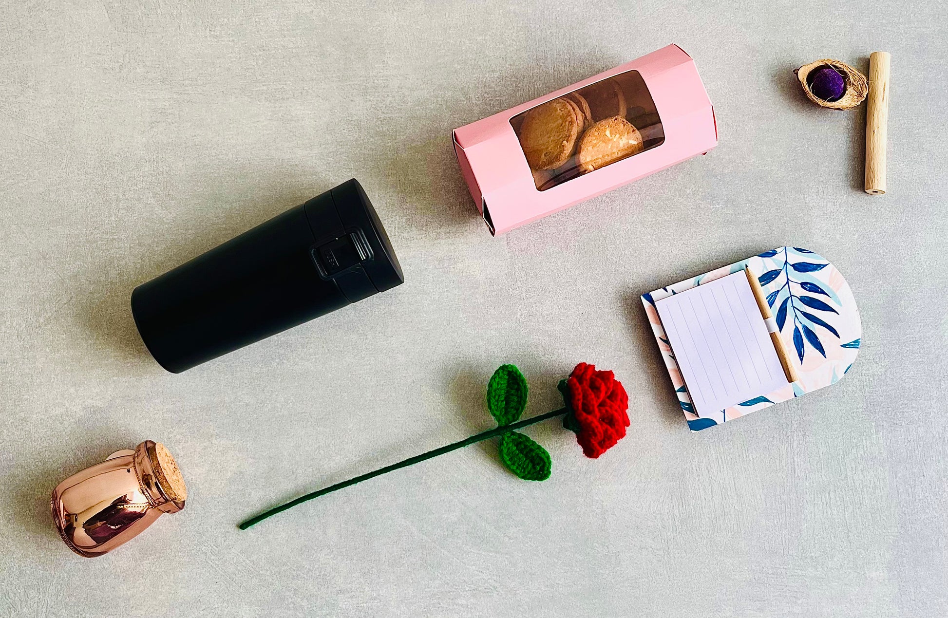 A thoughtful hamper blending warmth, sweetness, and a handmade touch. Keep beverages just the way you like with the insulated tumbler, enjoy delicious cookies, and create a cozy mood with the charming candle. The crochet rose adds a personal handmade feel, while the fridge magnet serves as a keepsake reminder of a special moment. Perfect for heartfelt gifting on birthdays, anniversaries, or festive occasions.