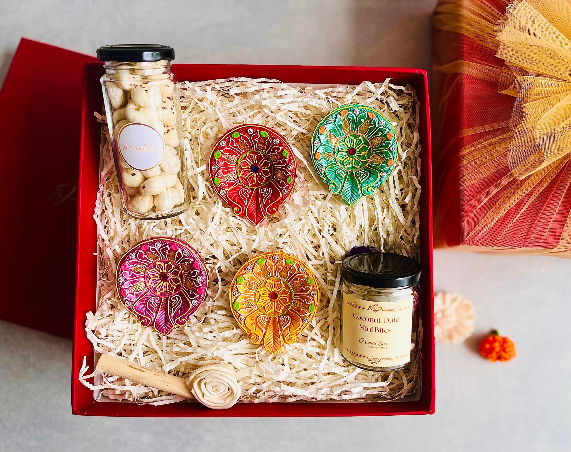 A thoughtful mix of tradition and wellness — light up your home with handcrafted clay diyas, enjoy the crunch of spicy makhana, and indulge in the natural sweetness of date bites. A perfect festive hamper for family, friends, and colleagues.
