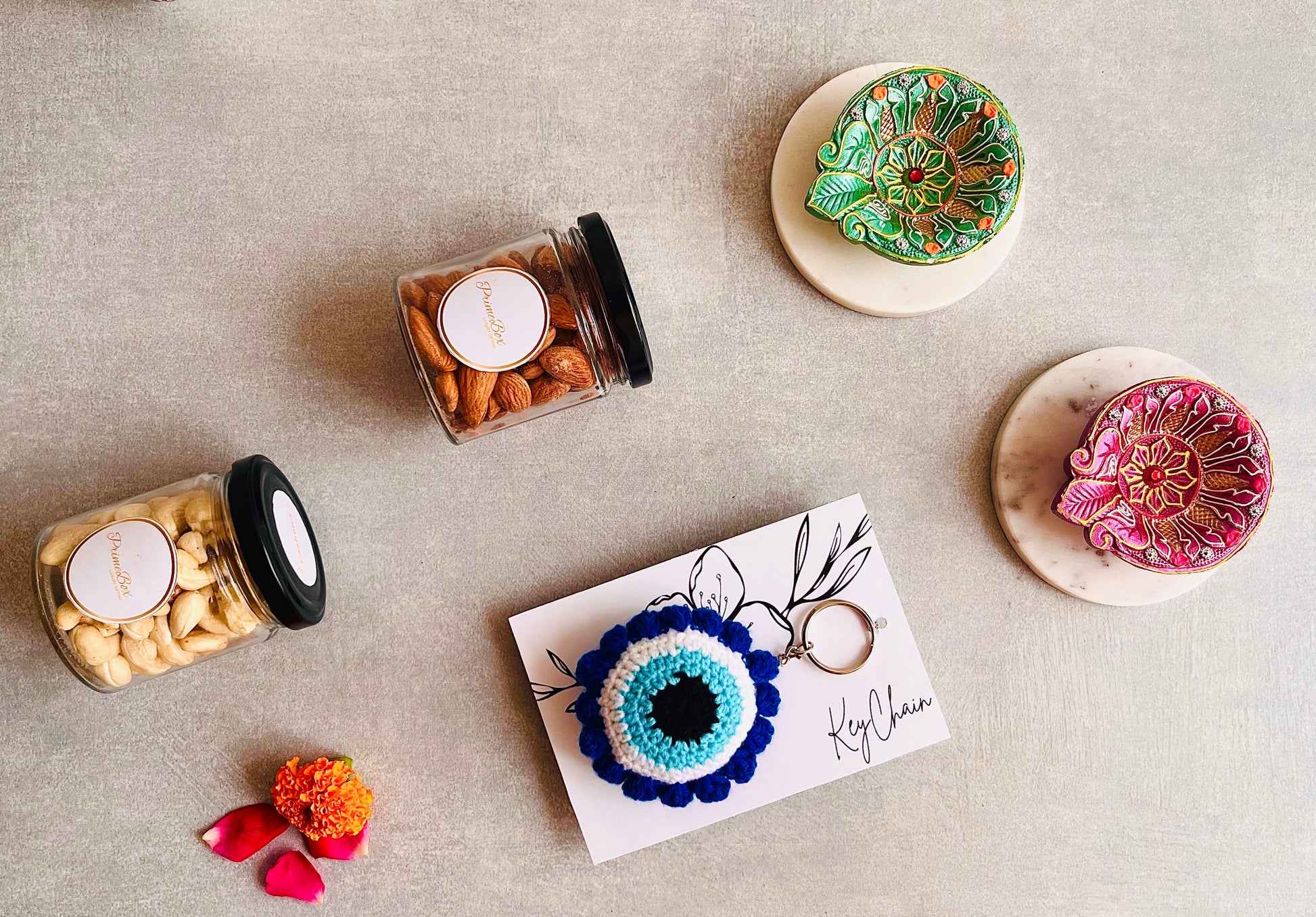 Celebrate light and togetherness with this thoughtful hamper. Share the wholesome crunch of roasted nuts, brighten homes with traditional diyas, and add a touch of charm with a handcrafted crochet key chain. A perfect choice for Diwali, festive gifting, or a meaningful gesture for loved ones.