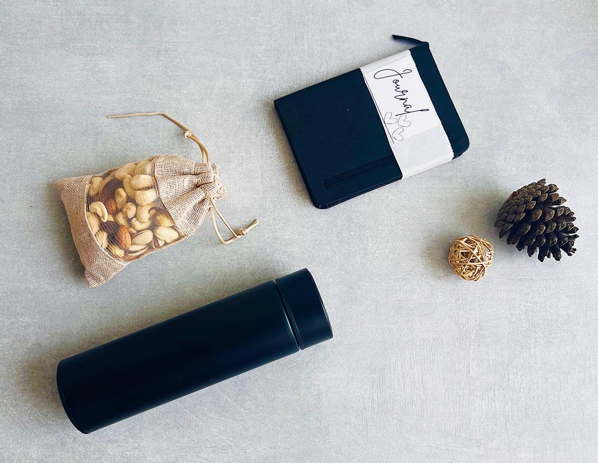 Designed for balance and productivity, this hamper is a perfect blend of wellness and elegance. Stay hydrated with the smart temperature display bottle, enjoy the healthy crunch of mixed dry fruits, and capture ideas, plans, or reflections in the journal. A thoughtful choice for corporate gifting, wellness hampers, or everyday self-care.