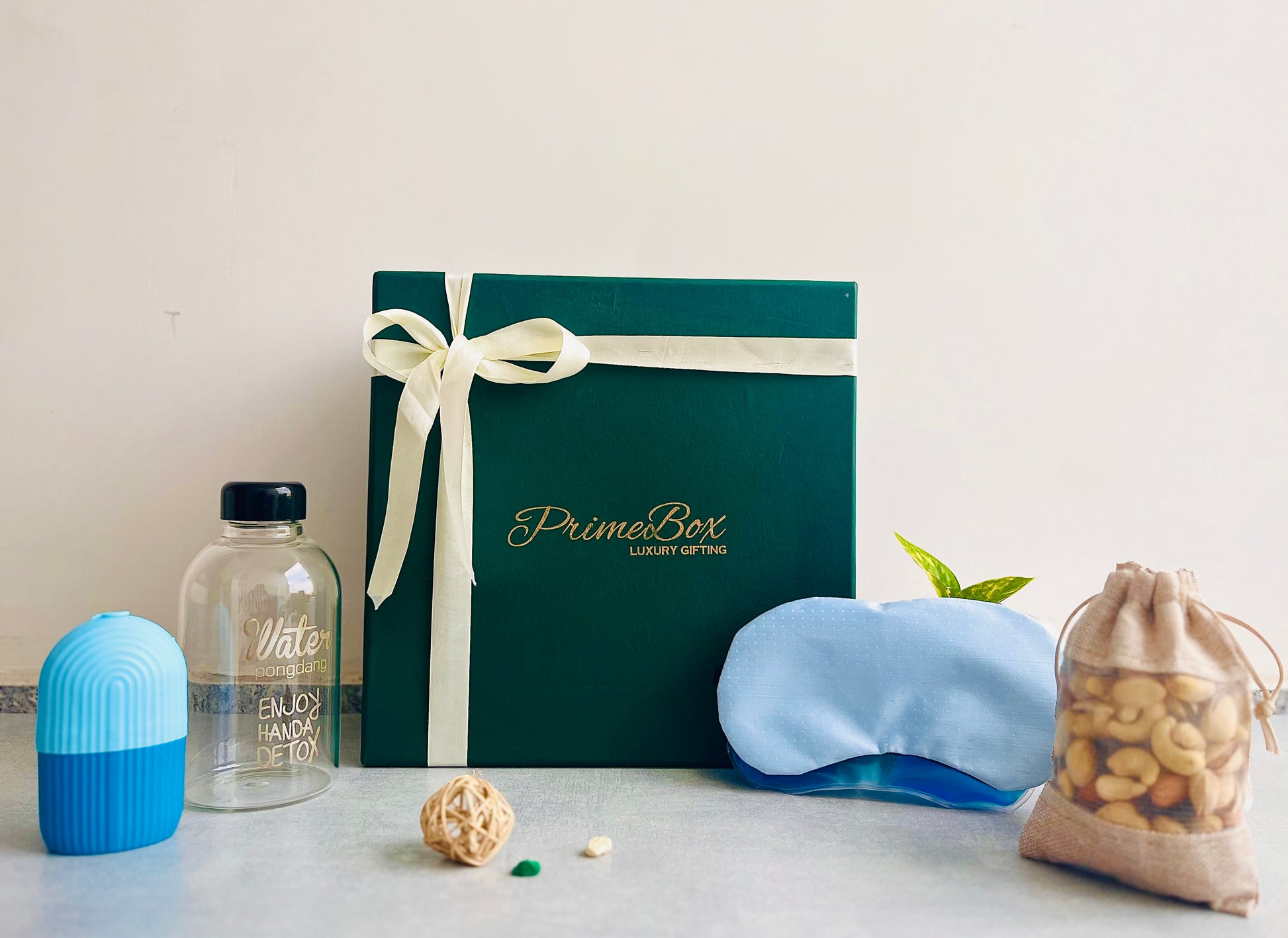 A thoughtfully curated hamper for moments of relaxation and refreshment. Stay hydrated with the sleek glass water bottle, rejuvenate your skin with the cooling ice roller and eye mask, and enjoy a wholesome treat with the mix of premium dry fruits. Perfect for wellness enthusiasts, birthdays, or as a thoughtful gift to show care and consideration.